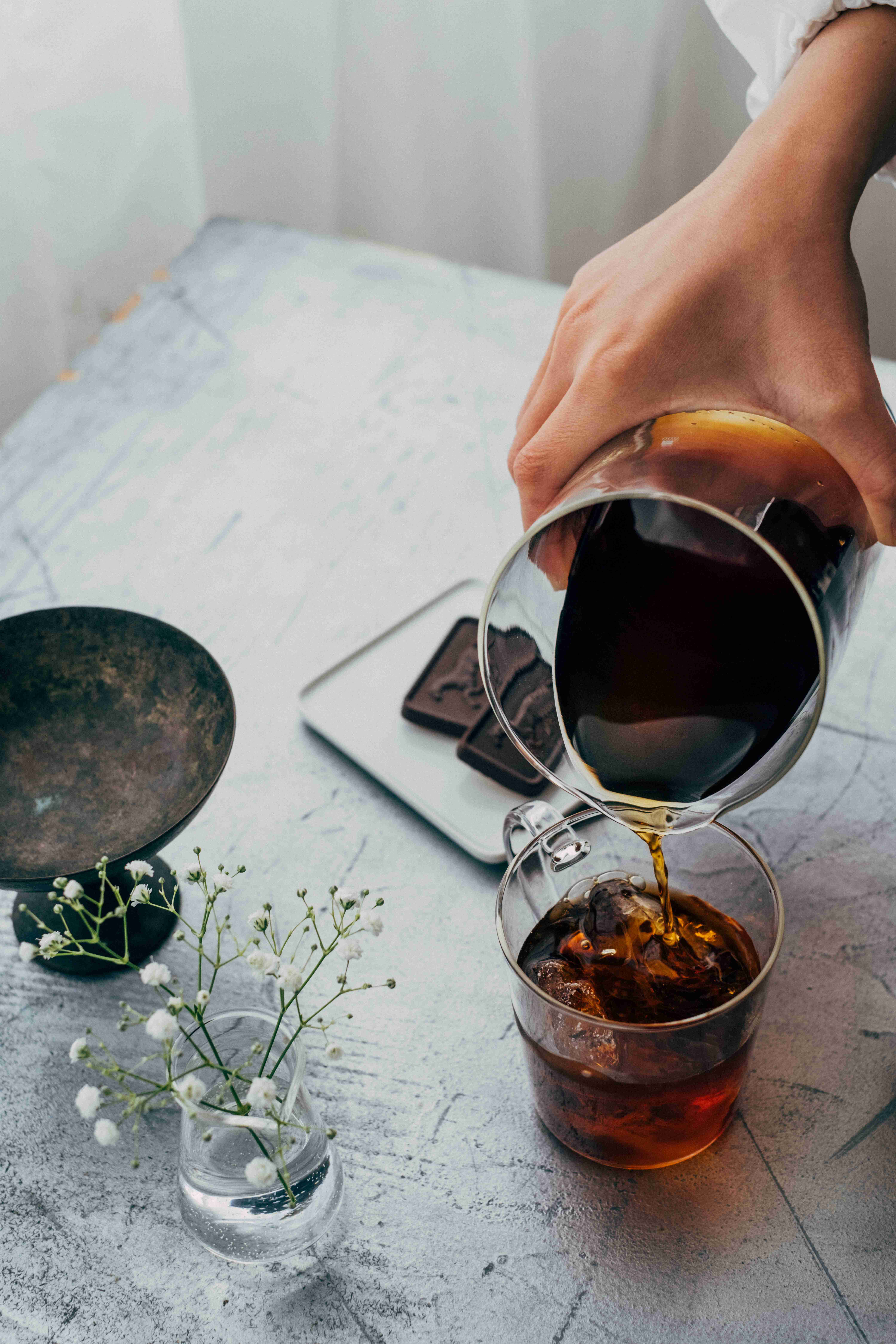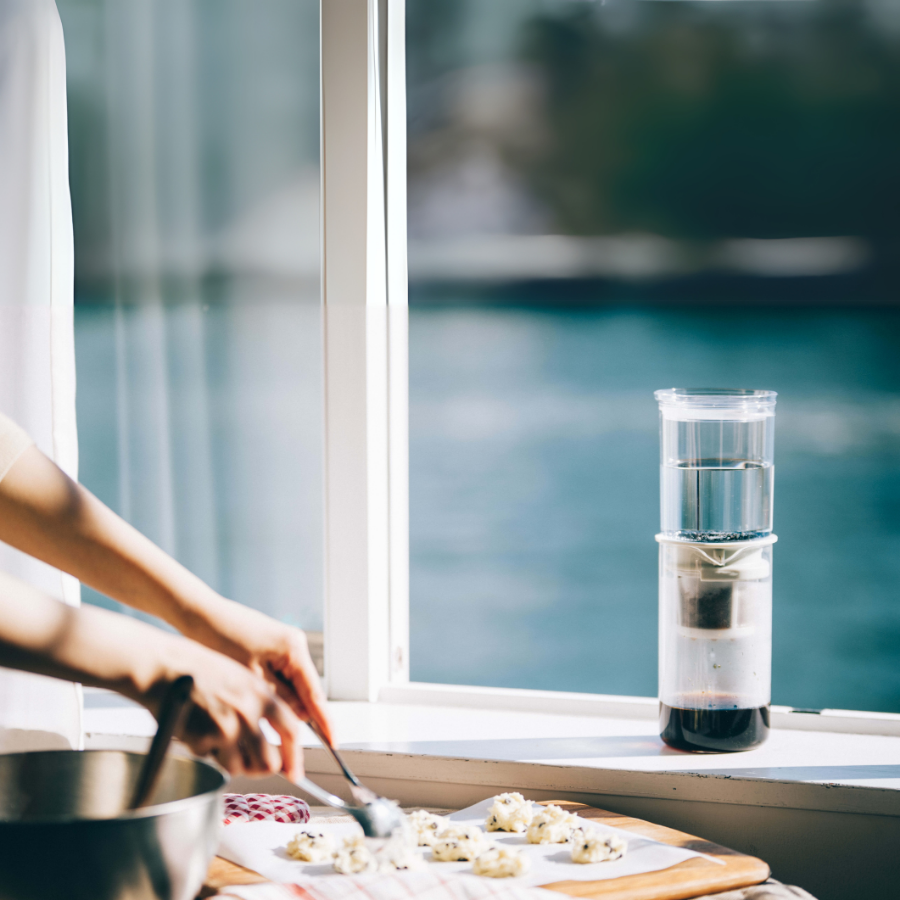 Bước 4: Thêm 630ml nước vào bình, đợi nước từ từ thấm qua cà phê và nhỏ xuống bình dưới trong khoảng 45-60 phút.