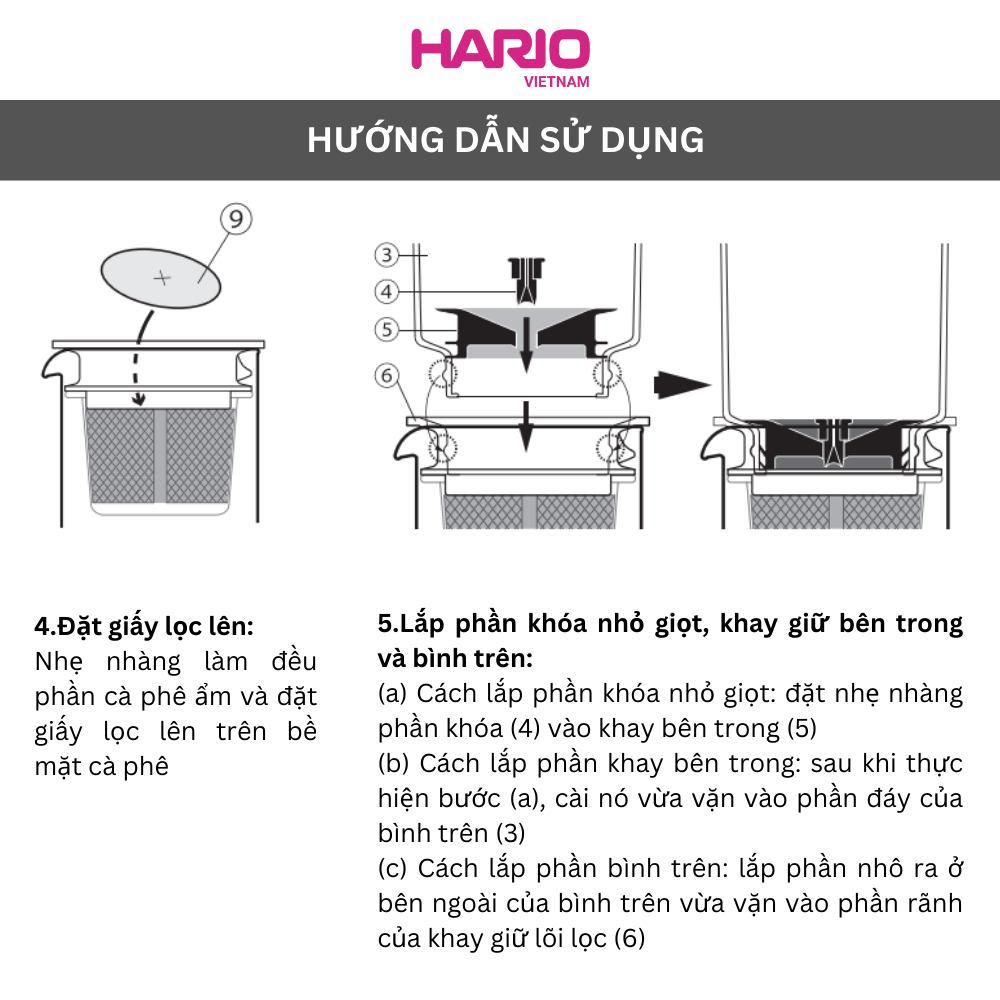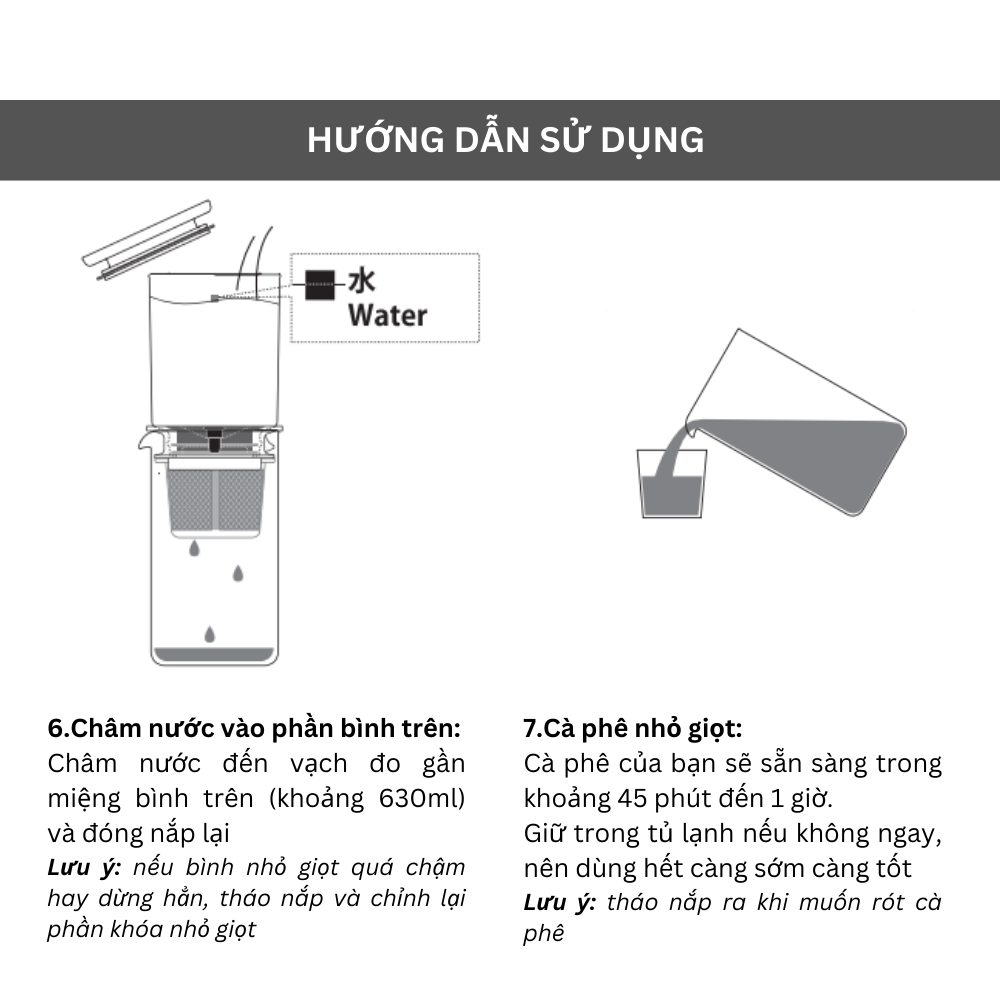 *Đổ nước vào 1 lần. Nước nhỏ từng giọt thấm vào cà phê. Ly cà phê nhỏ giọt của bạn sẽ sẵn sàng trong 45-60 phút.