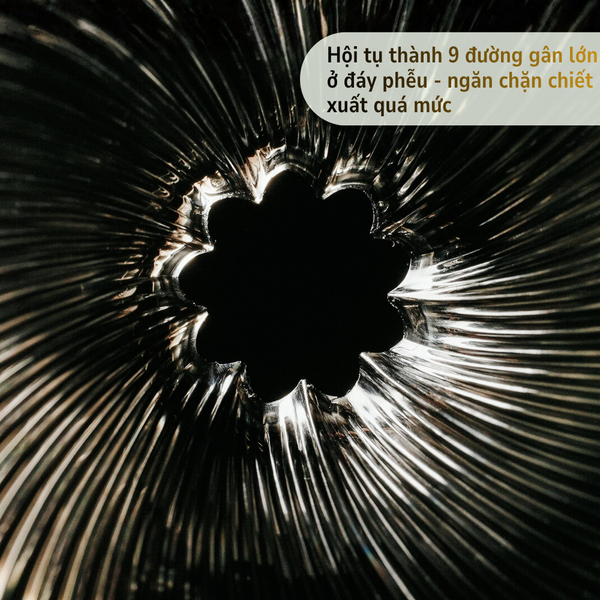 - Ở đáy phễu, các đường gân nhỏ này được hội tụ lại thành 9 đường gân lớn. Cấu trúc nguyên bản này cho phép nước chảy đều dọc theo toàn bộ thành phễu, giúp hạn chế việc cà phê bị chiết xuất quá mức.
